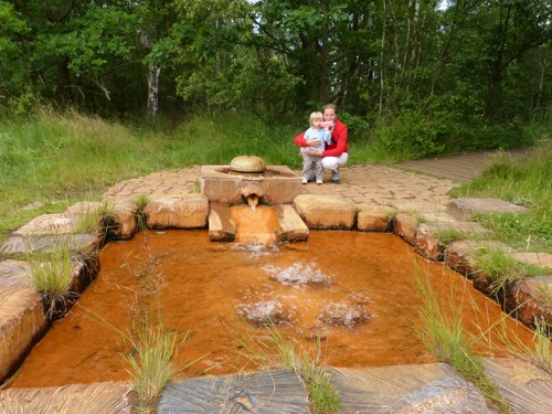 Po projití stezky se vracíme na začátek místní silničkou. Podél ní vede úzkokolejka, která dřív vozila vytěžený kaolí, dnes slouží jen jako turistická atrakce, v době našeho pobytu bohužel nebyla v provozu. Zavítáme k minerálnímu prameni Věra kousek od silničky. Žádné z masožravých rostlin, popsaných na zdejší tabuli NS (bublinatky, rosnatky), na které se Jitka těšila že uvidí v přírodě, však nenacházíme. Pramen jsem musel samozřejmě ochutnat. Pak už jen ve stánku naproti žel. zastávce Nový Drahov kupujeme dětem zmrzku a procházíme podél zvířecí záchranné stanice, kde pobíhají dva malí mufloni. Filípek je krmí travou, žerou jako diví. A už jsme u auta a následuje přejezd k dnes poslednímu místu.