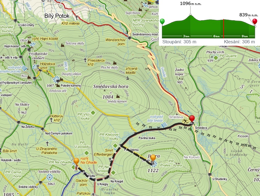 – 36km autem – chata Smědava /*42*/ (861asl) – 1,5km červ. – r.Pavlína louka – 0,5km červ. – r.Pod Jizerou (960asl) – 1km žlutá – vrchol Jizera (1122asl) – zpět 1km žlutá – r. Pod Jizerou – 1km červ. – Na Knejpě (kiosek) – 0,4 červ. – r. U Knejpy – 0,4km modrá – Rozhledna Čihadla /*1504*/ (980asl) – zpět (3,8km) – chata Smědava – 50km autem (+15 zajížďka do Bílého Potoka)