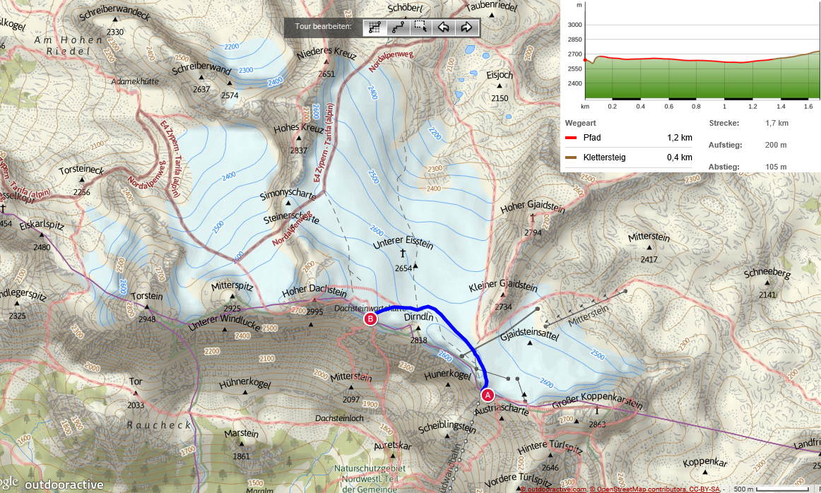 počítal jsem jen s krátkou procházkou po Dachsteinwarte k Seethallerhütte (nazývané také Dachsteinwartehütte) a odtud, že bychom si odskočili sami s Jíťou ferrátou na Hoher Dachstein (2995asl), no teď hlavně najít kudy k Seethallerhütte