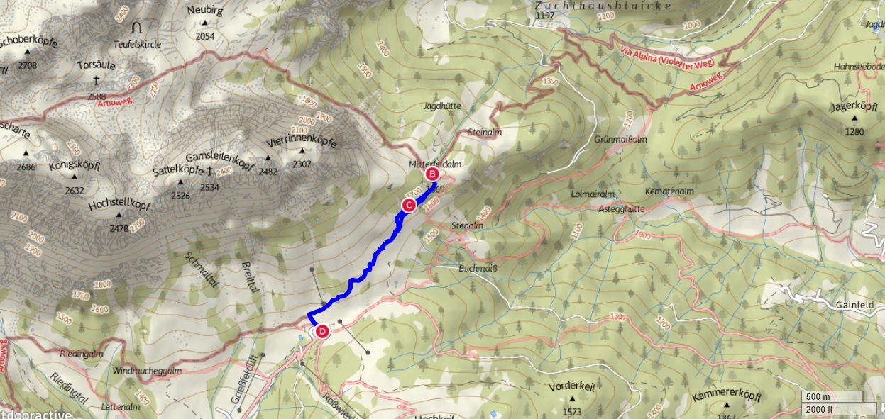 vytipovávám, která že by to mohla být ta vycházková cesta, co myslel Tonda a po malé svačince se vydáváme na cestu, na SV po AV 430 k Mitterfeldalm, kolem pěkné chaloupky, která je k pronajmutí