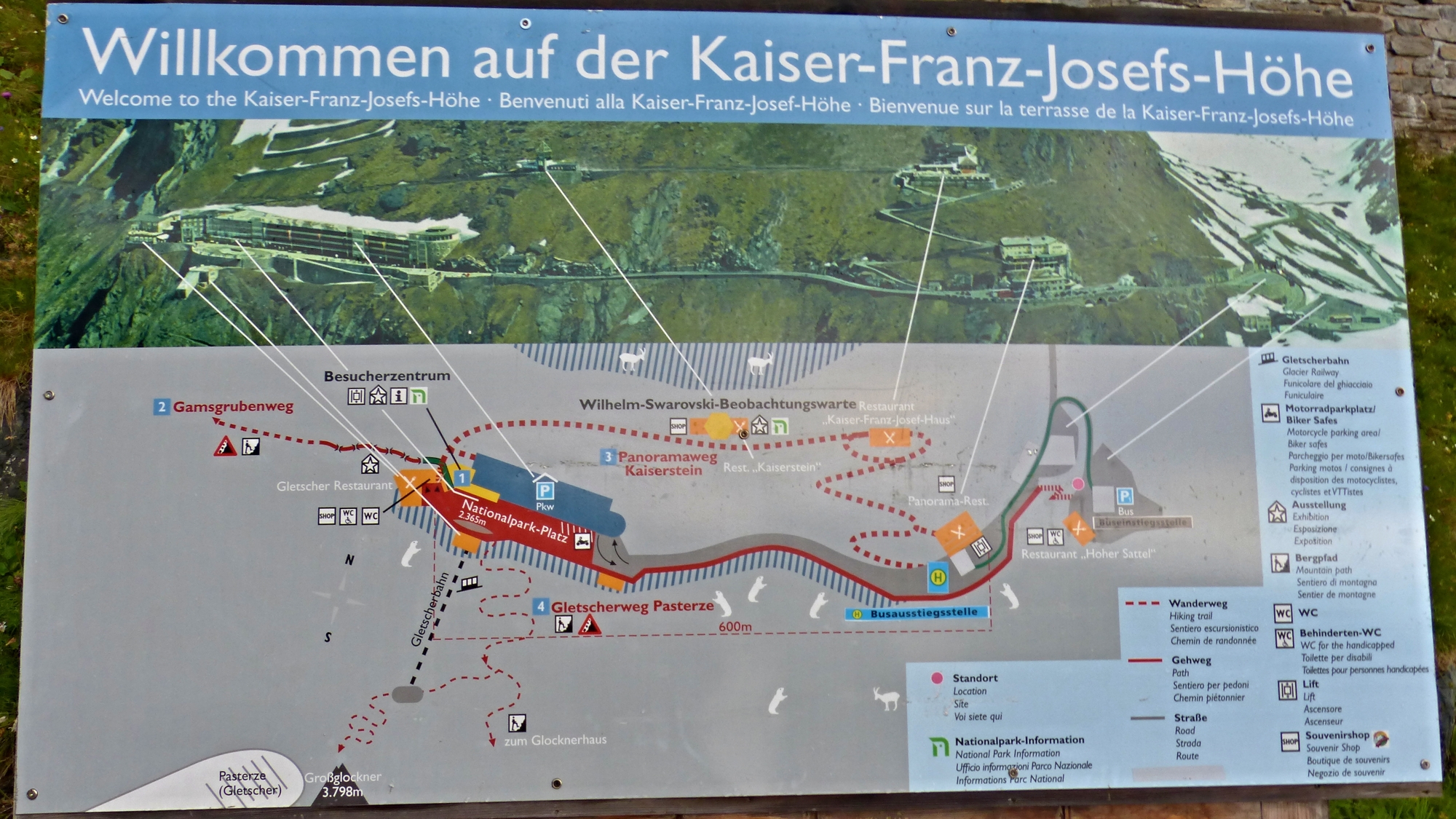 návštěvnické středisko Kaiser-Franz-Josefs-Höhe(2360m) s obrovským parkovištěm, obchůdky se suvenýry, muzeem, sociálním zařízení a restaurací, je zde spoustai informačních tabulí pojednávajících o ledovci, jeho vzniku a historii, jakož i o okolních horách, součástí centra je i rozhledna „Wilhelm Swarovski“; teploměr zde ukazuje 8,5°C