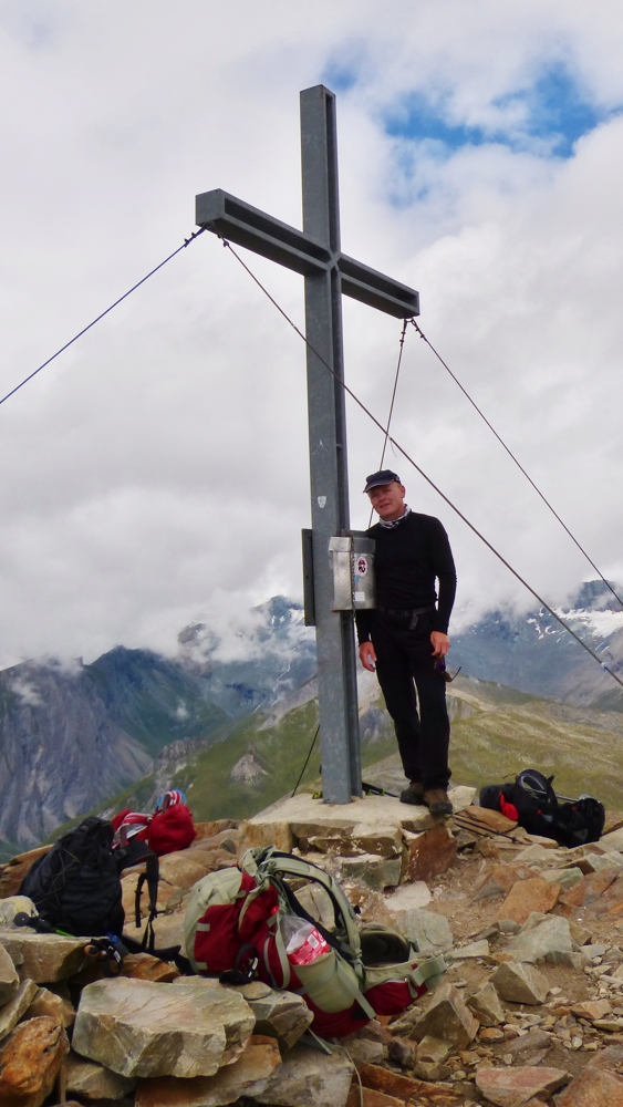 přeskákat hřebínek a jsem u kříže (12:50), nějak jsem se zabral do videa a ztratil někde Petra, tak se pro něj vracím, vzdušnější hřebínek mu trochu dělá potíže a chce rezignovat – že tam nepůjde, zahazuju mu bágl, kterej přeci jenom trochu znejisťuje balanc a přechází ho v pohodě – je nadšený, hned chce udělat fotky, kochá se – je prostě vidět, že má radost, je nejvýš, co kdy byl…, hlavně že muselo být těch keců předtím, než ho sem člověk dostal