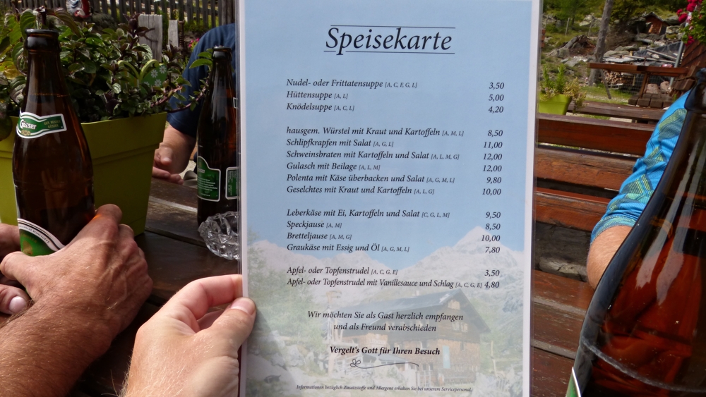 12:10 sedáme si k volnému stolu přímo u vchodu do chaty Lienzer Hütte (1977m)