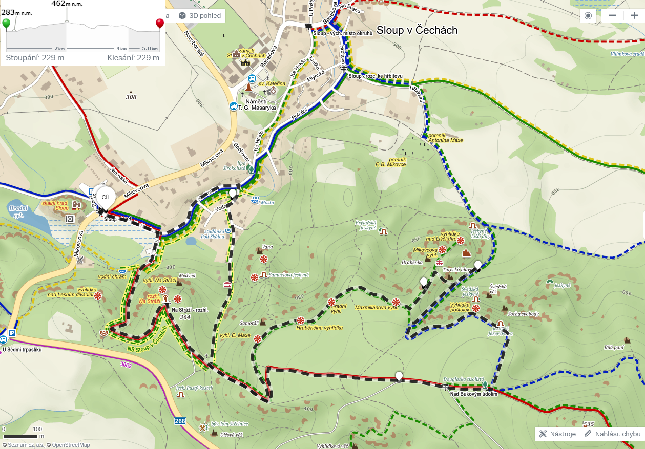 potom pokračujeme kolem vyhlídky u Turka zbylým zeleným vyhlídkovým okruhem zpět do Sloupu, dostávám se do rozepře s Nelčou, která nechce chodit za ruku přes exponovanější úseky a místo toho lítá nejlépe po hraně skály, kam vidím, že každou chvíli musí spadnout, holt přichází na řadu hrubá síla, ale k její veliké nelibě