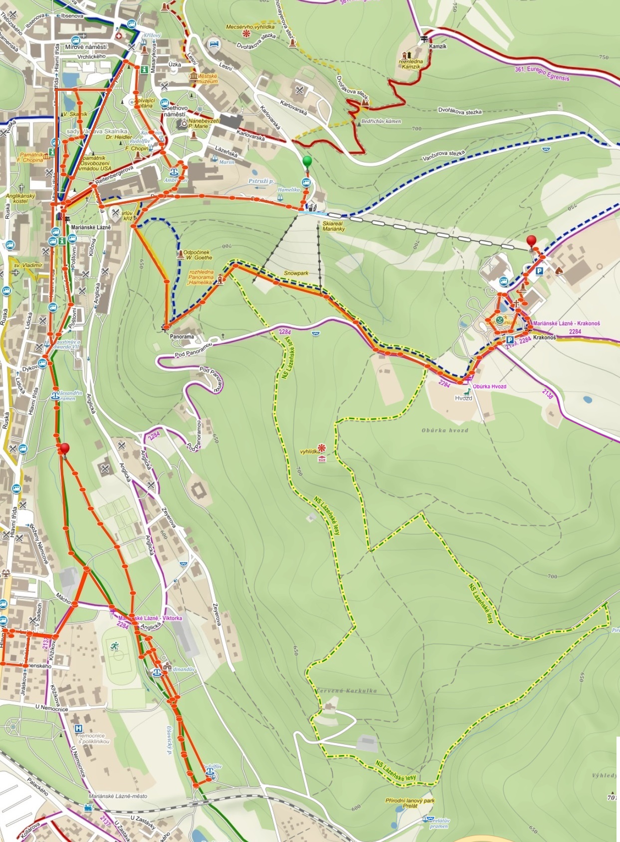 dolů na kolonádu je to odtud jen asi 500 metrů; na fotce to tak nevypadá, ale protější louka je dost prudká sjezdovka, po jejím vršku odpoledne ještě půjdeme na rozhlednu Hamelika