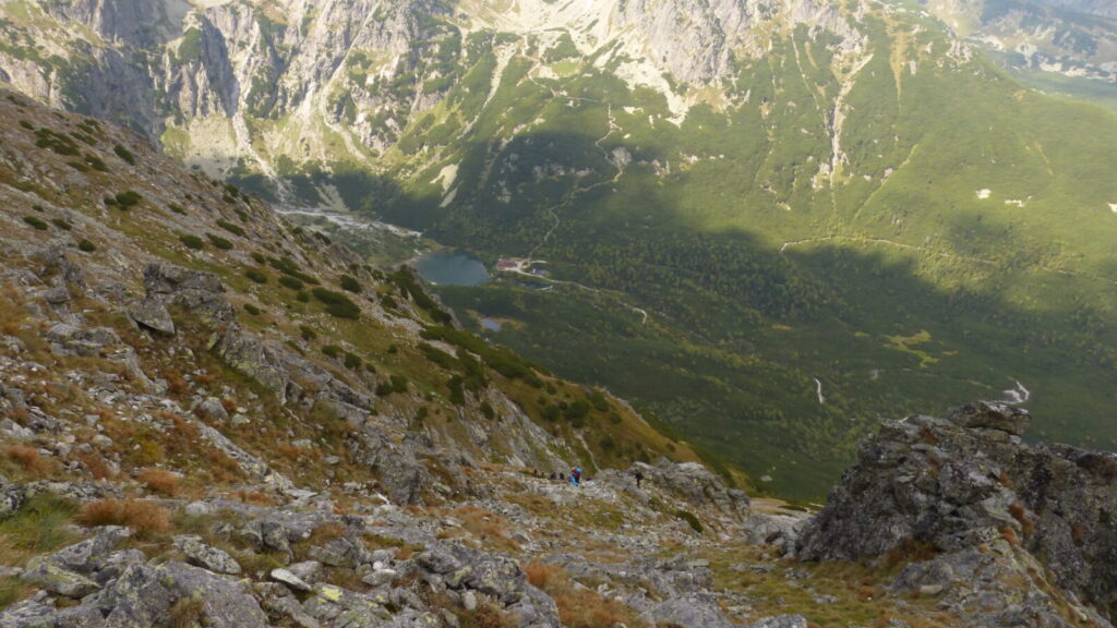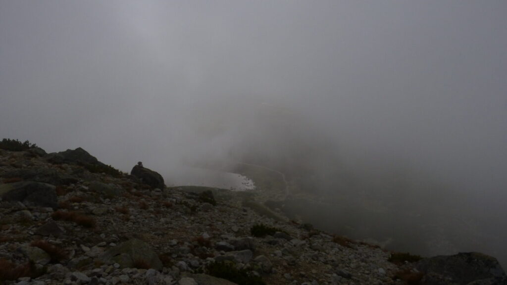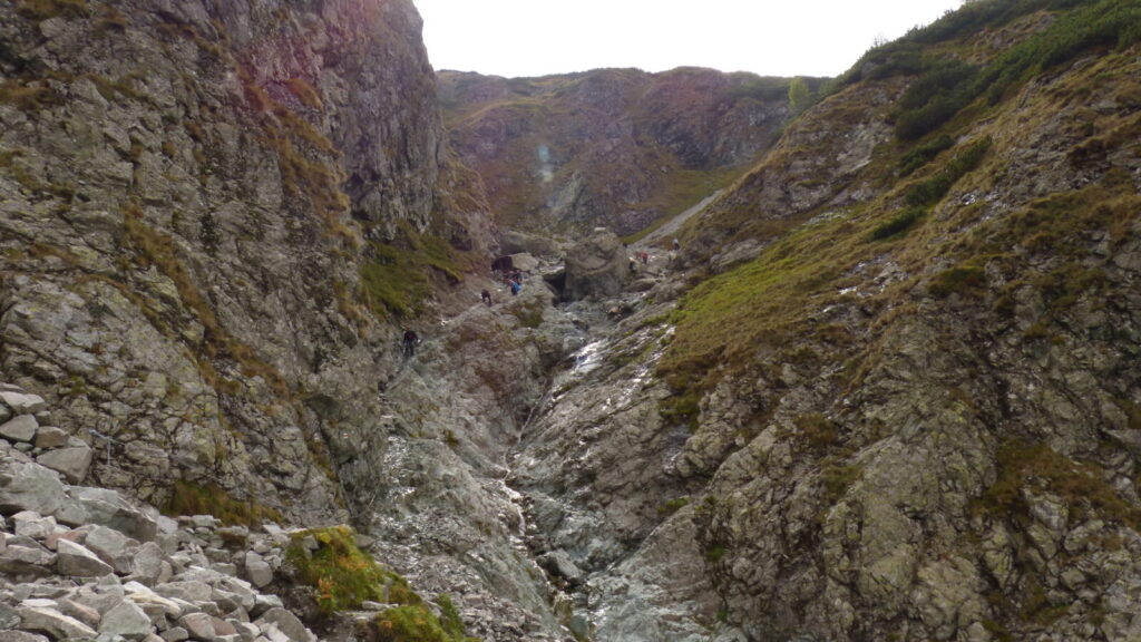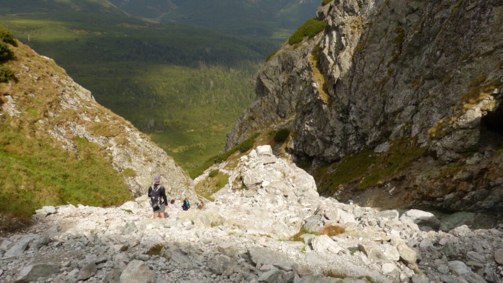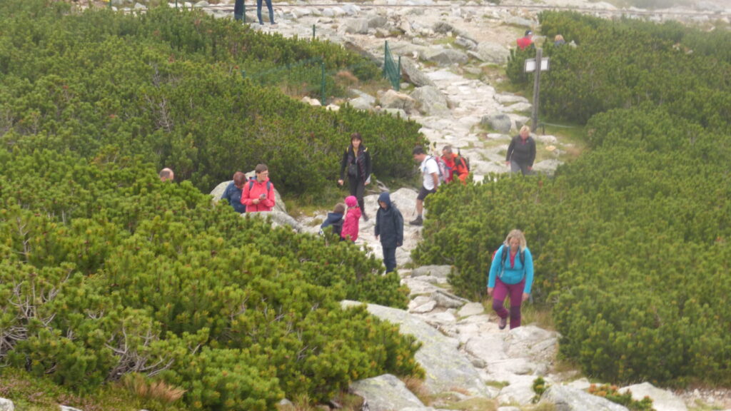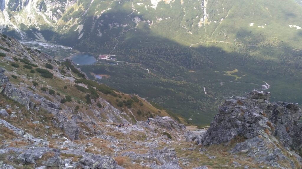 Vracím se ke skupině a dáváme se na cestu do doliny, říkám si, že si až plesu zaběhnu, serpentýny nejprve v kamenném poli, pak mezi nekonečnou kosodřevinou, které se asi v polovině mění na krátký sestup v průrvě skalou, protéká tudy potok, naštěstí sestup po kluské skále je jištěn řetězy
