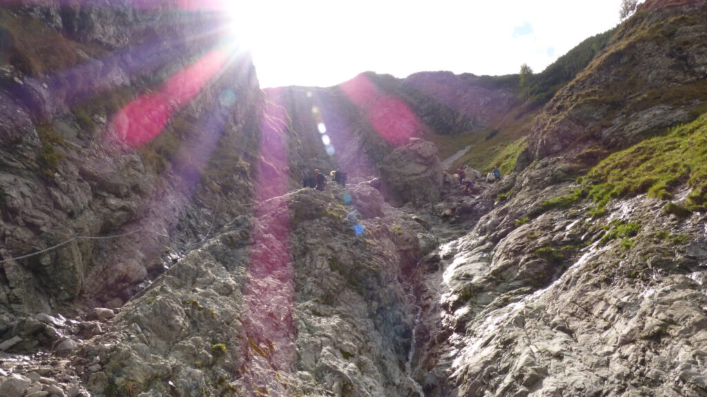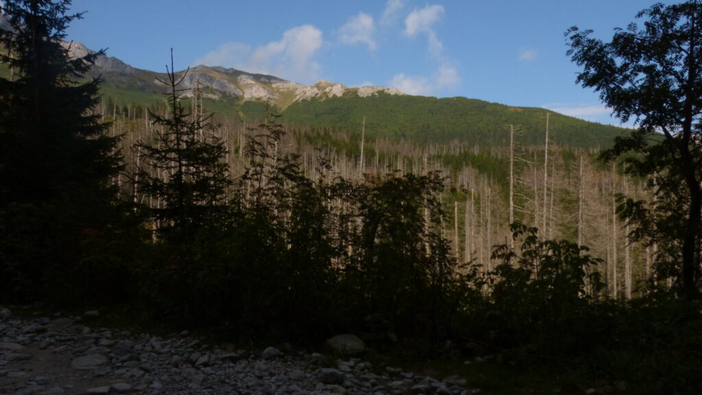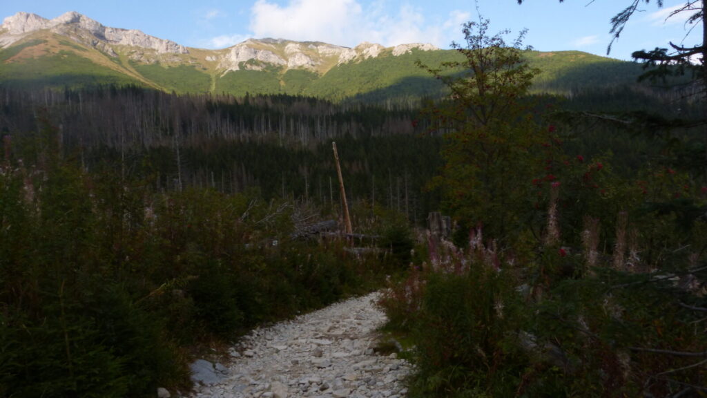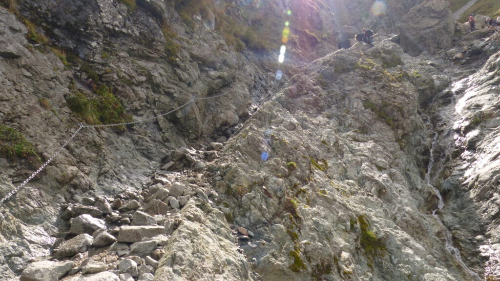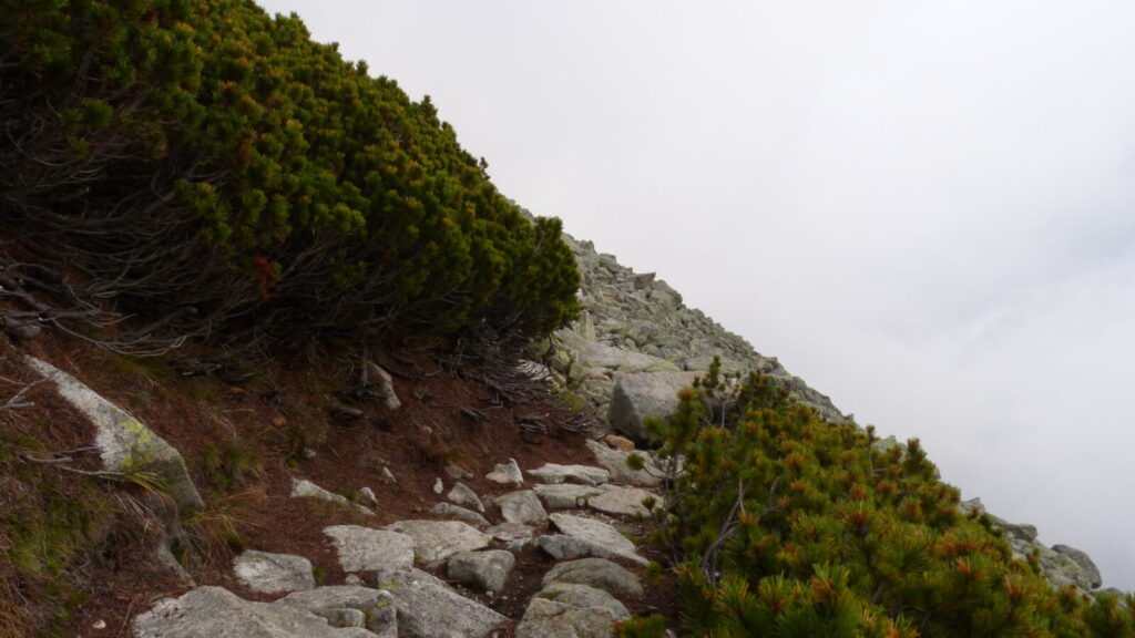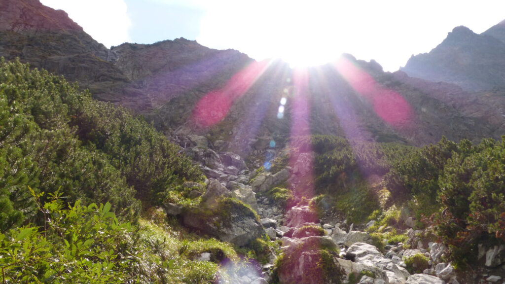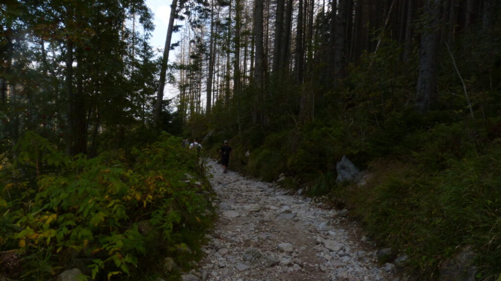 Vracím se ke skupině a dáváme se na cestu do doliny, říkám si, že si až plesu zaběhnu, serpentýny nejprve v kamenném poli, pak mezi nekonečnou kosodřevinou, které se asi v polovině mění na krátký sestup v průrvě skalou, protéká tudy potok, naštěstí sestup po kluské skále je jištěn řetězy