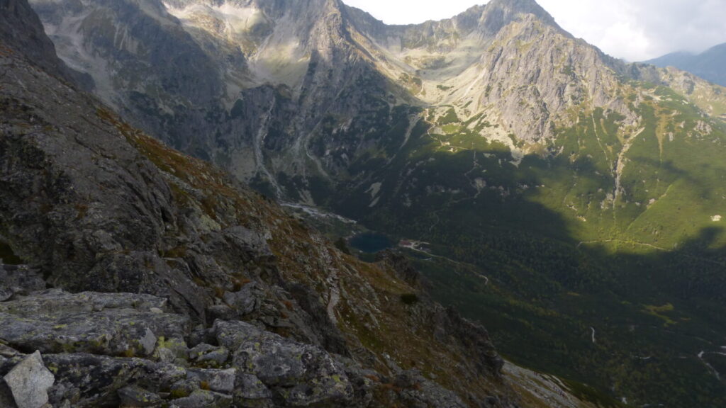 Blíží se poledne, je čas na malou svačinku. Do sedla zbývá už asi jen půl hodina, tak není kam spěchat. Skutečně po půl jedné jsme v Sedle pod Svišťovkou (2023m) a otevírá se nám úchvatný pohled do Doliny Zeleného plesa, je to neskutečná hloubka. Ještě to umocňuje stín, který nyní na údolí vrhá naše hora.