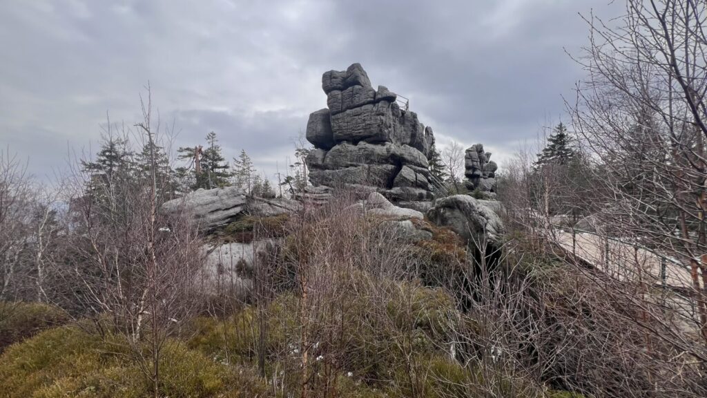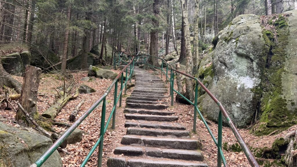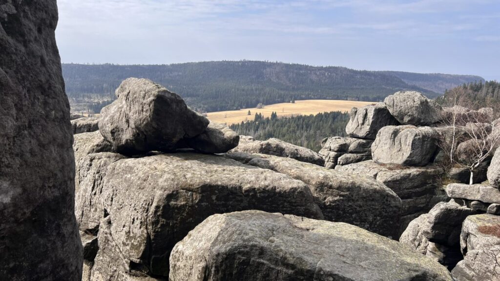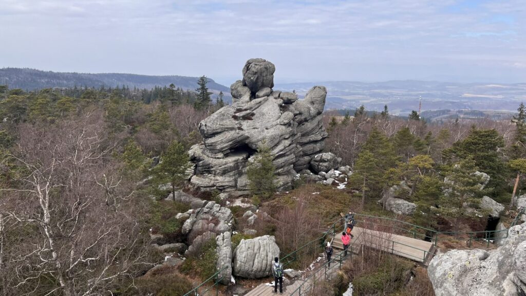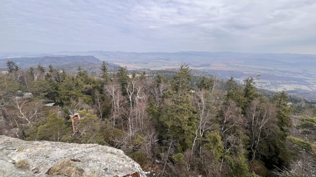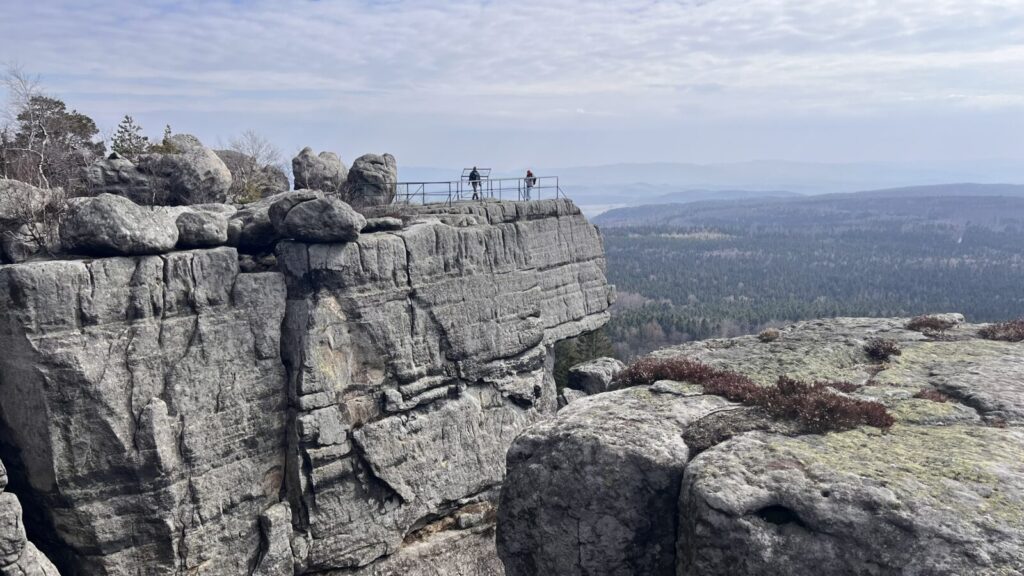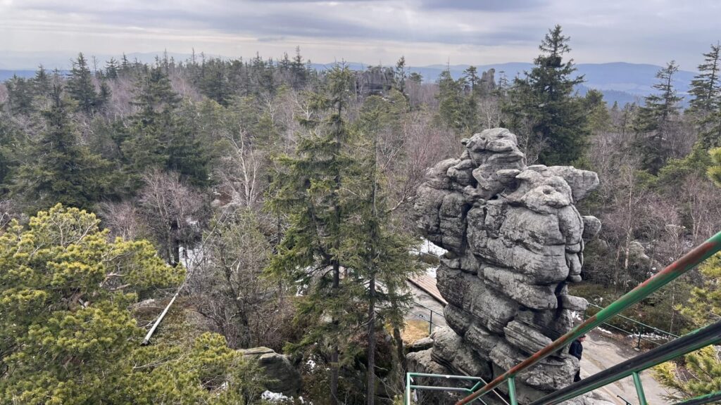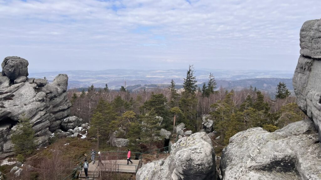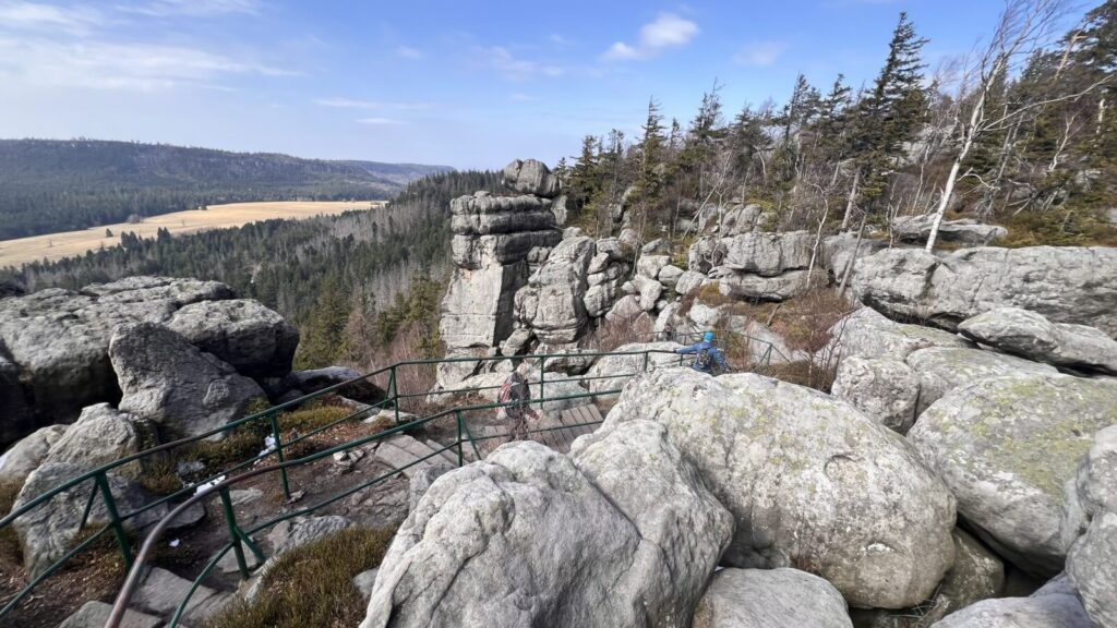 Dál pokračujeme přes malé skalní bludiště na další dvě vyhlídky Jižní Terasy se skalním útvarem “Serce Ducha Gór”, pod námi vidíme Karlów s parkovištěm