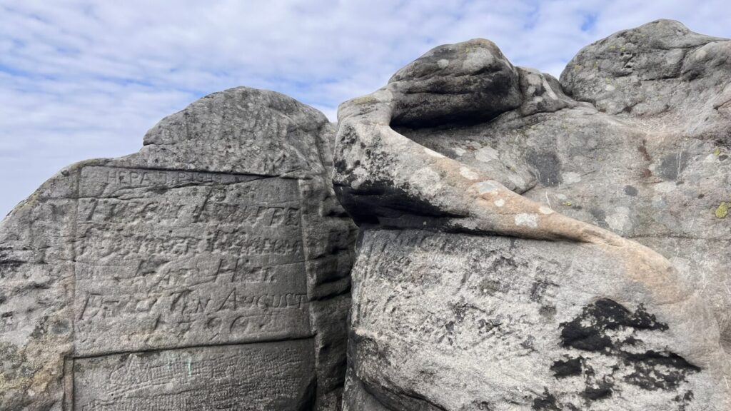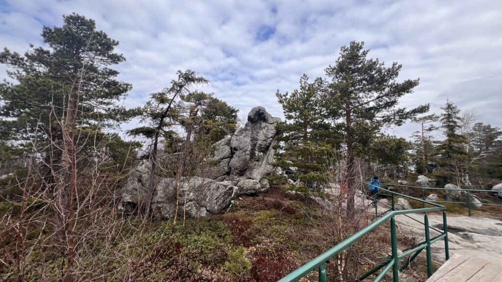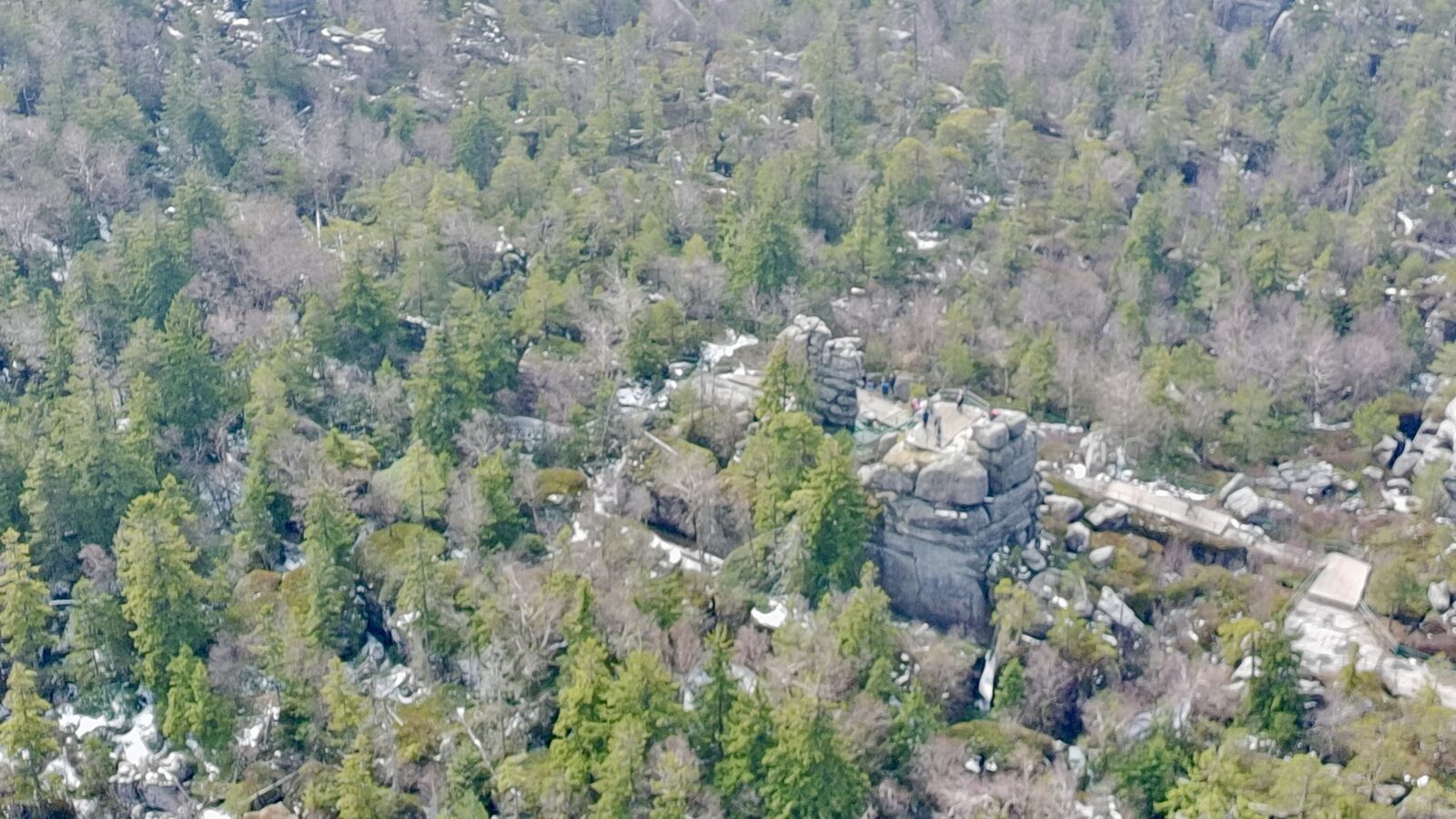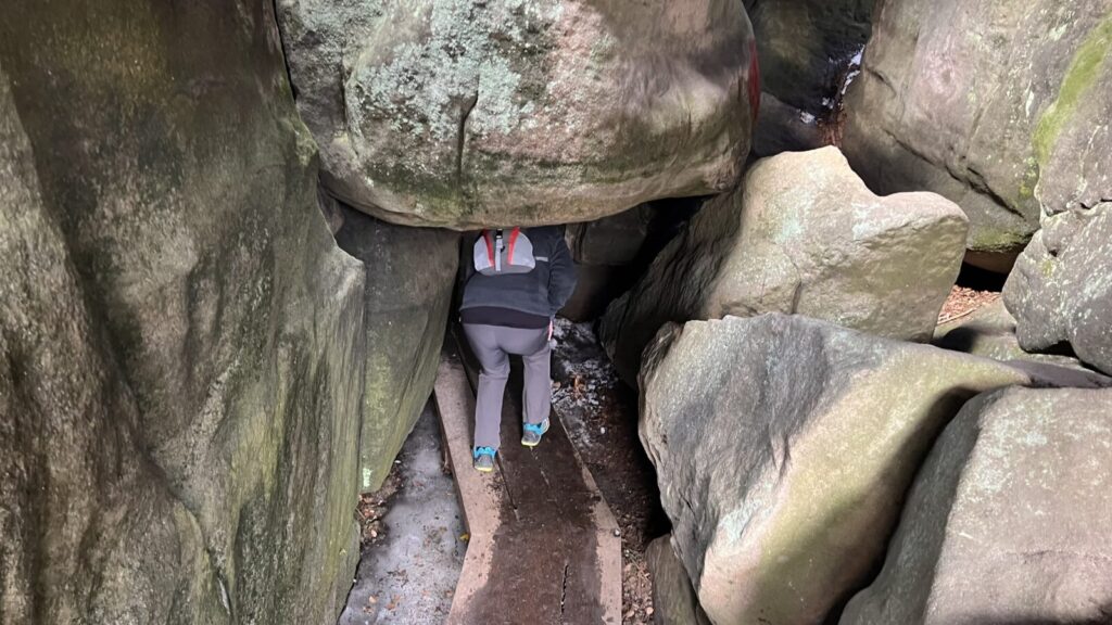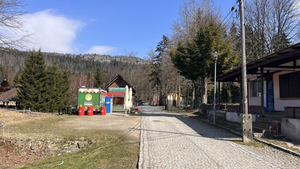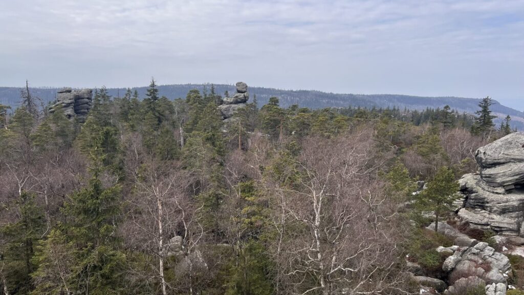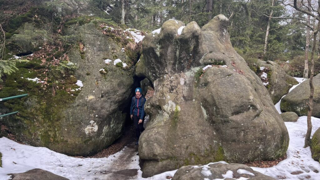 Dál pokračujeme přes malé skalní bludiště na další dvě vyhlídky Jižní Terasy se skalním útvarem “Serce Ducha Gór”, pod námi vidíme Karlów s parkovištěm