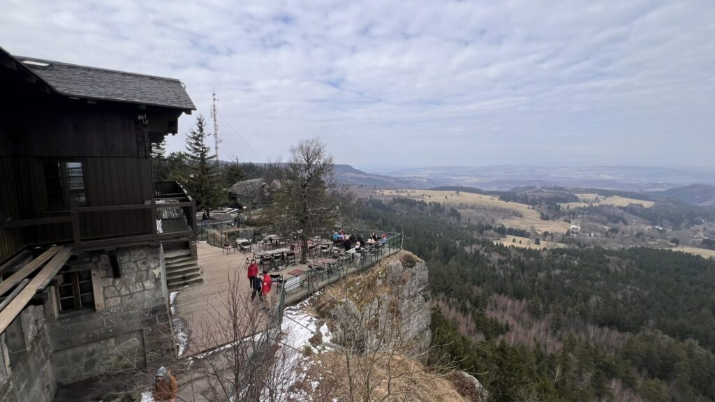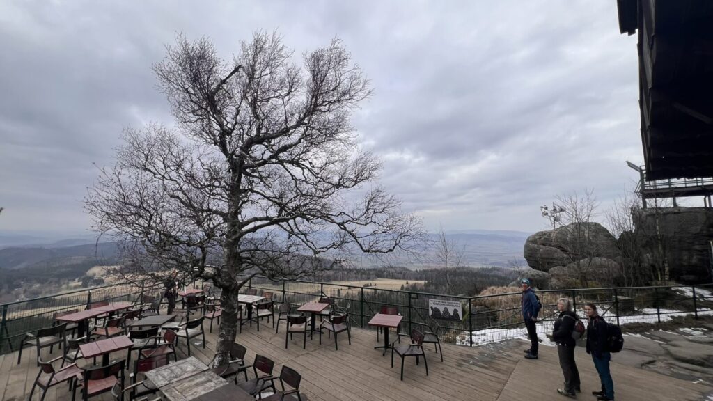 Je vidět Horská chata PTTK „Na Szczelińcu”. Od chaty se otevírá vyhlídka na severní výběžek Česka na nedaleké Broumovské stěny