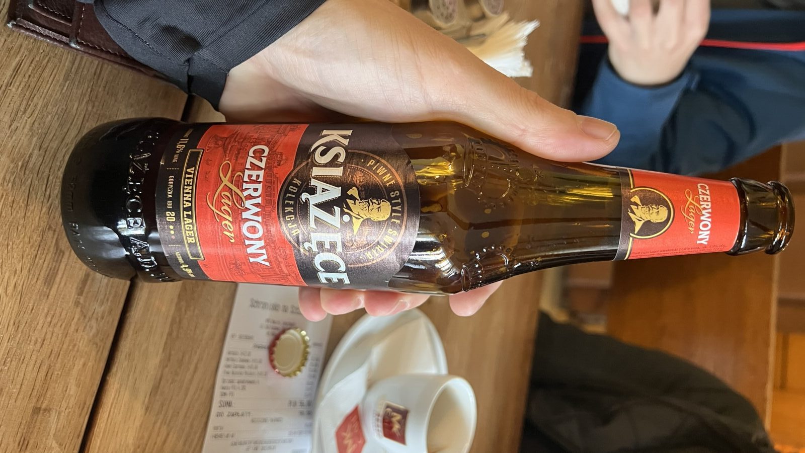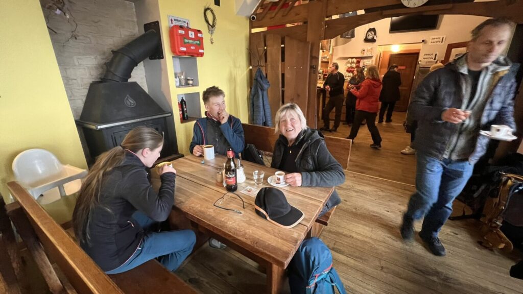Je zima, tak se jdeme trochu ohřát do chaty, nabídka nic moc, nemají žádné zahřívadlo do čaje ani vínko, jen lahvové pivo v cenách od 19 do 23PL, mezi nimi Kozel, tak zkouším aspoň něco