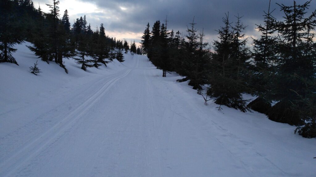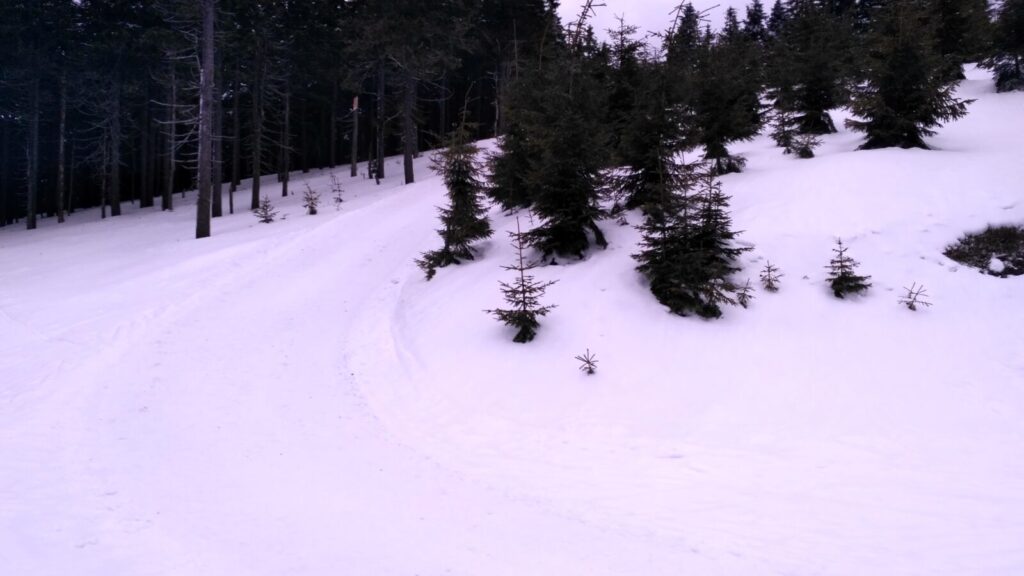 Odsud pokračujeme doprava po hřebínku na Bachledku. Po propršelé noci je to vcelku terénní vložka, ale jenom kousek.